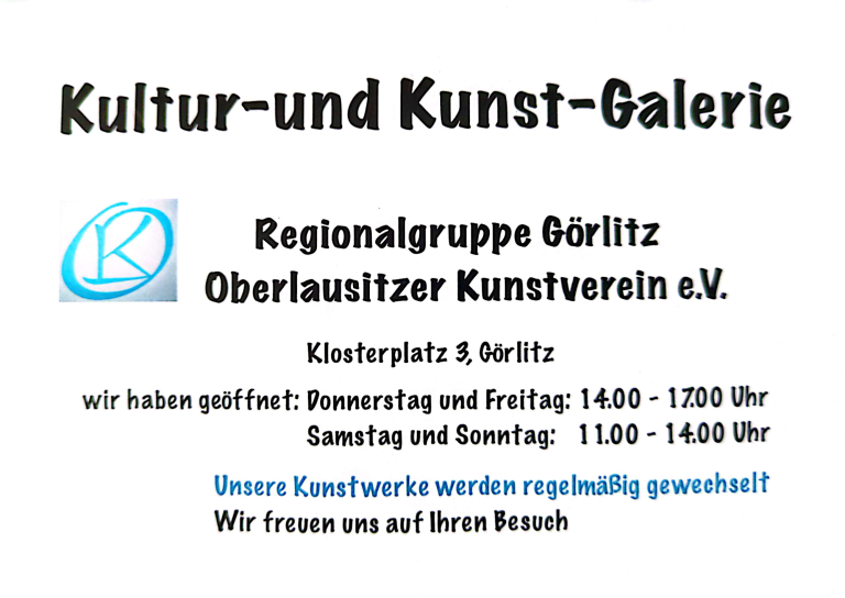 Einige meiner Bilder sind aktuell in der Kultur-und Kunst-Galerie des Oberlausitzer Kunstvereins e.V. in Görlitz (Klosterplatz 3) ausgestellt. Die Bilder sind zu erwerben.